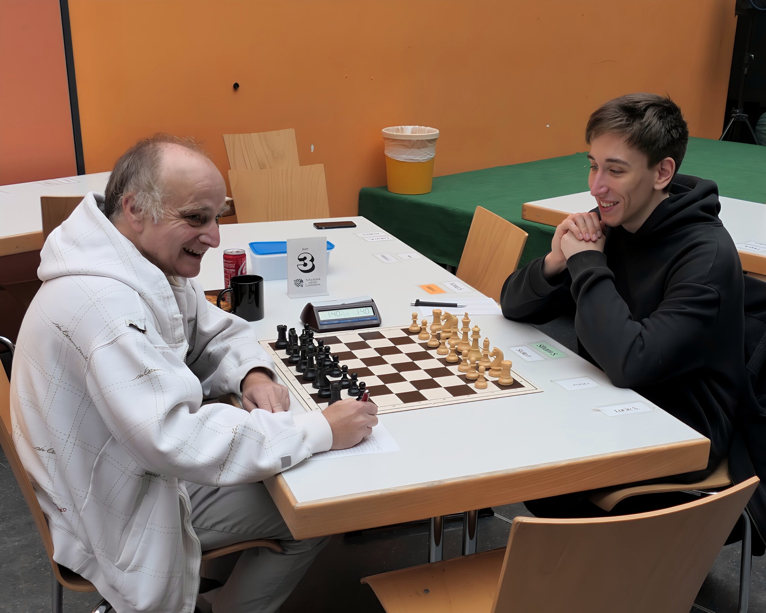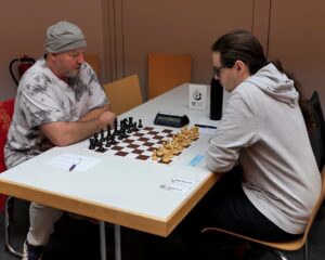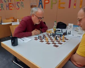Jaroslaw Szylmann eröffnete den Reigen der entschiedenen Partien, indem er in einem ausgeglichenem Endspiel seinem Gegner Werner Mühlpfordt (DWZ 1906) ein Remis anbot, das dieser annahm. In einem Doppelturmendspiel mit gleichfarbigen Läufern hatte Jaroslaw zwar etwas Raumvorteil, dennoch musste diese Partie ja nicht überstrapaziert werden. Nach circa 3 Stunden verlor der Berichterstatter dann seine Partie. Obwohl er am Spitzenbrett gegen Felix Wacker (DWZ 2011) eine durchaus angenehme Stellung hatte, glaubte er, sich nicht passiv verteidigen zu dürfen und nahm das Opfer des Lambsheimers (Sh4) an. Da aber für den Heimspieler plötzlich noch ein Folgeopfer möglich war (bald Lxf4 und es entscheidet die ungedeckte Dame auf b3), war das Matt nicht mehr zu verhindern. Eine schlechte Verteidigungsleistung des Berichterstatters; es stand 0,5:2,5 aus unserer Sicht.