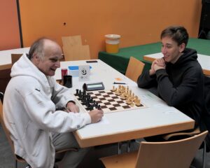 Milan Schneble aber, der bisher eine Topsaison spielt (drei Spiele, drei Siege), stellte gegen seinen Gegner Roland Simon (DWZ 2082) den Anschluss wieder her. Dabei behandelte Milans Gegner die Eröffnung sehr provozierend, vielleicht um seinen eher unerfahrenen Gegner auf unbekanntes Terrain zu locken. Entsprechend dominant wirkten auch die Figuren Milans im Zentrum des Brettes, zahlreiche Taktiken mussten vom Heimspieler genauestens berechnet werden. Am Ende entschied aber eine solche Taktik, gegen einen Springerverlust konnte er sich nicht mehr wehren, wir hatten nun 1,5 Punkte. Da war es sehr erfreulich, dass Mirco Friedhoff seine Partie Remis halten konnte. Im Mittelspiel schien es so, dass er von seinem Gegner Michael Achatz (DWZ 1785) zusammengeschoben werden würde, aber da letzterer zu viel Zeit verbrauchte und diese immer knapper wurde, verflachte die Partie zu einem ausgeglichenen Endspiel, in dem Mirco sogar einen Mehrbauern, allerdings einen schwachen, besaß.