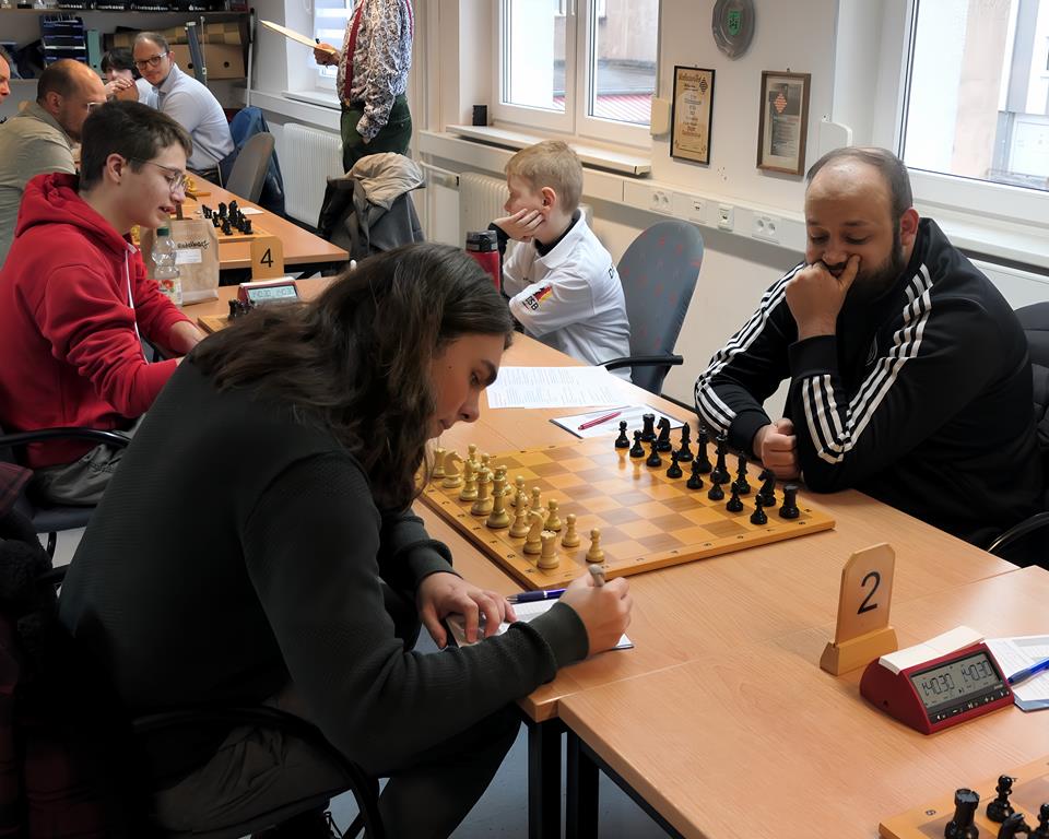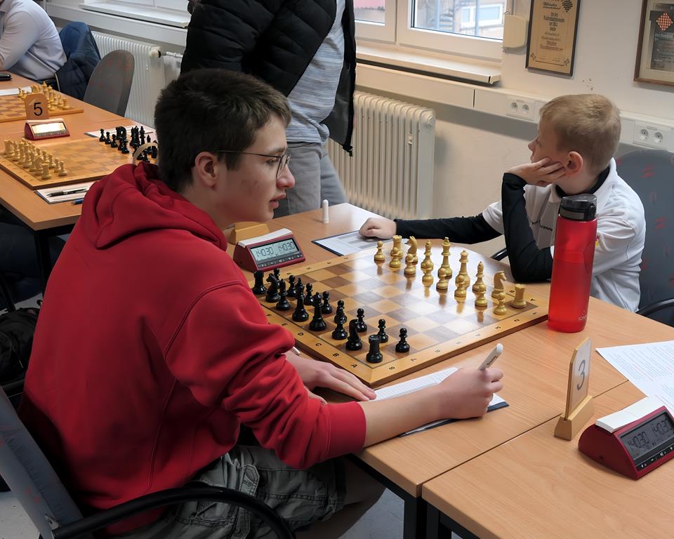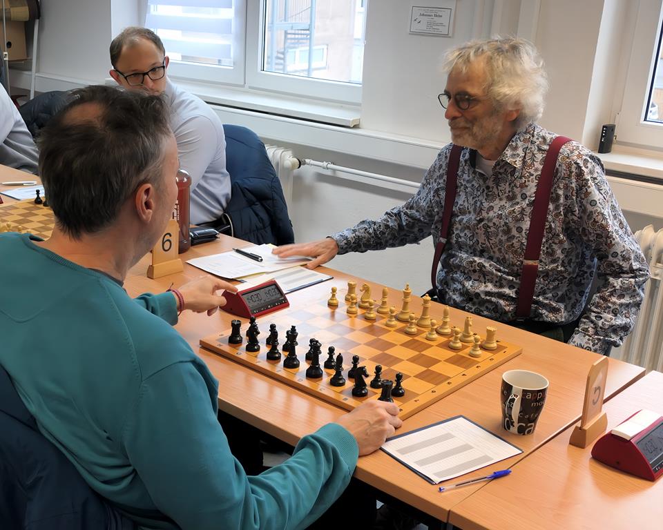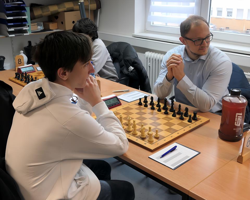 Emil Bleisinger hatte gegen Denis Yakovenko (DWZ 1983) eine schwierige Stellung auf dem Brett, die nicht ganz dem Stellungstyp entsprach, den Emil normalerweise bevorzugt. Als der Gegner bei fast vollem Brett Remis anbot war es deswegen die richtige Entscheidung, dieses anzunehmen. Tatsächlich hatten wir nun schon 2,5 Punkte, als David Schwarz von Peter Steinbrenner (DWZ 1919) ebenfalls ein Remisangebot erhielt. David ließ zunächst seine Zeit laufen, die Dinge erwartend, die da noch kommen würden. Es ging erfreulicherweise weiter mit einem Sieg. Tim Biehl hatte gegen Johannes Denzer (DWZ 1867) einen Bauern gewonnen und kurze Zeit später waren seine Schwerfiguren dermaßen stark zentralisiert, dass zwei weitere Bauern folgten – die Stellung war aufgabereif. Dabei muss man sagen, dass Tim als Weißer in der Eröffnung nicht die beste Variante wählte, wohl aber, um nicht in die Vorbereitung seines Gegners zu laufen.