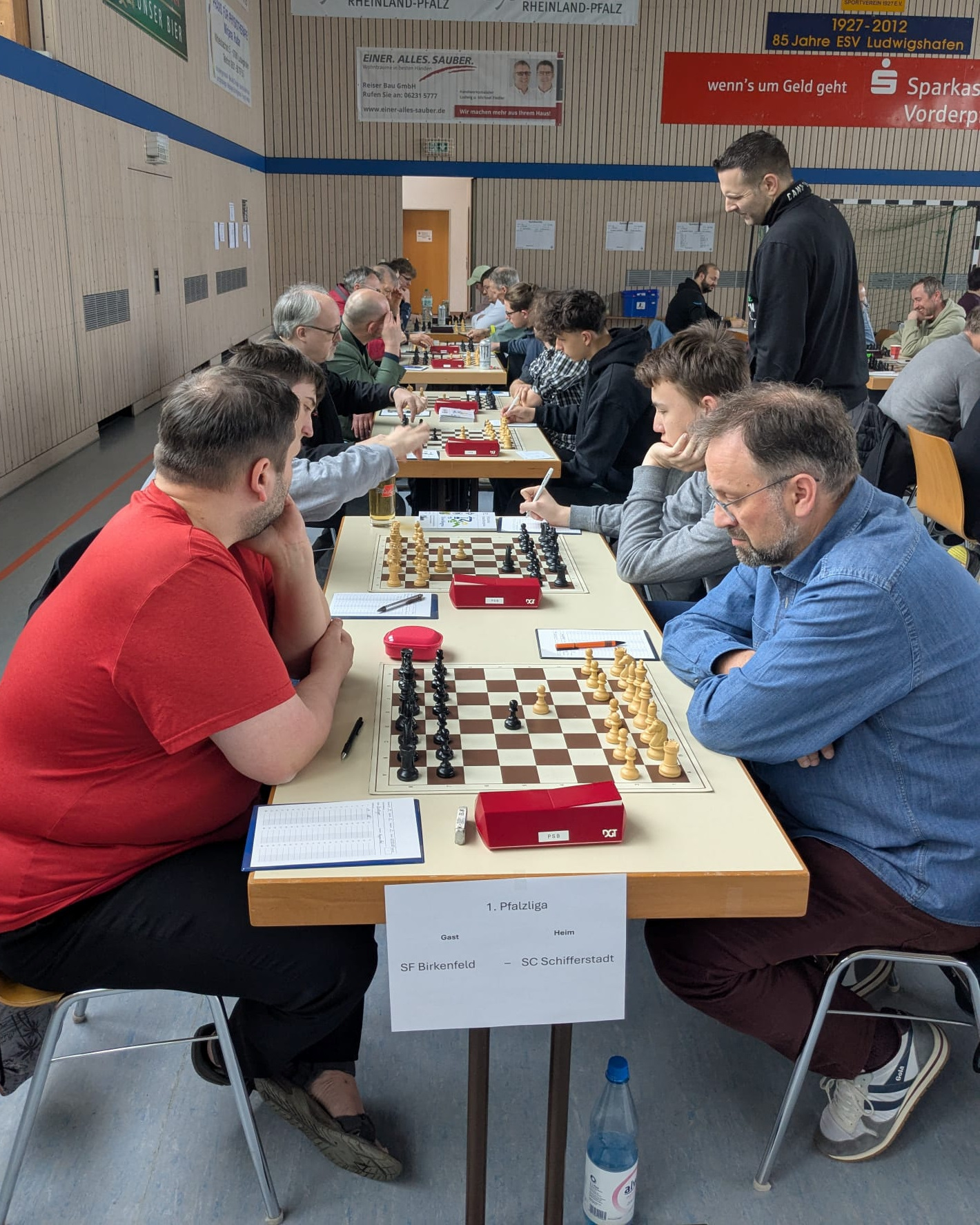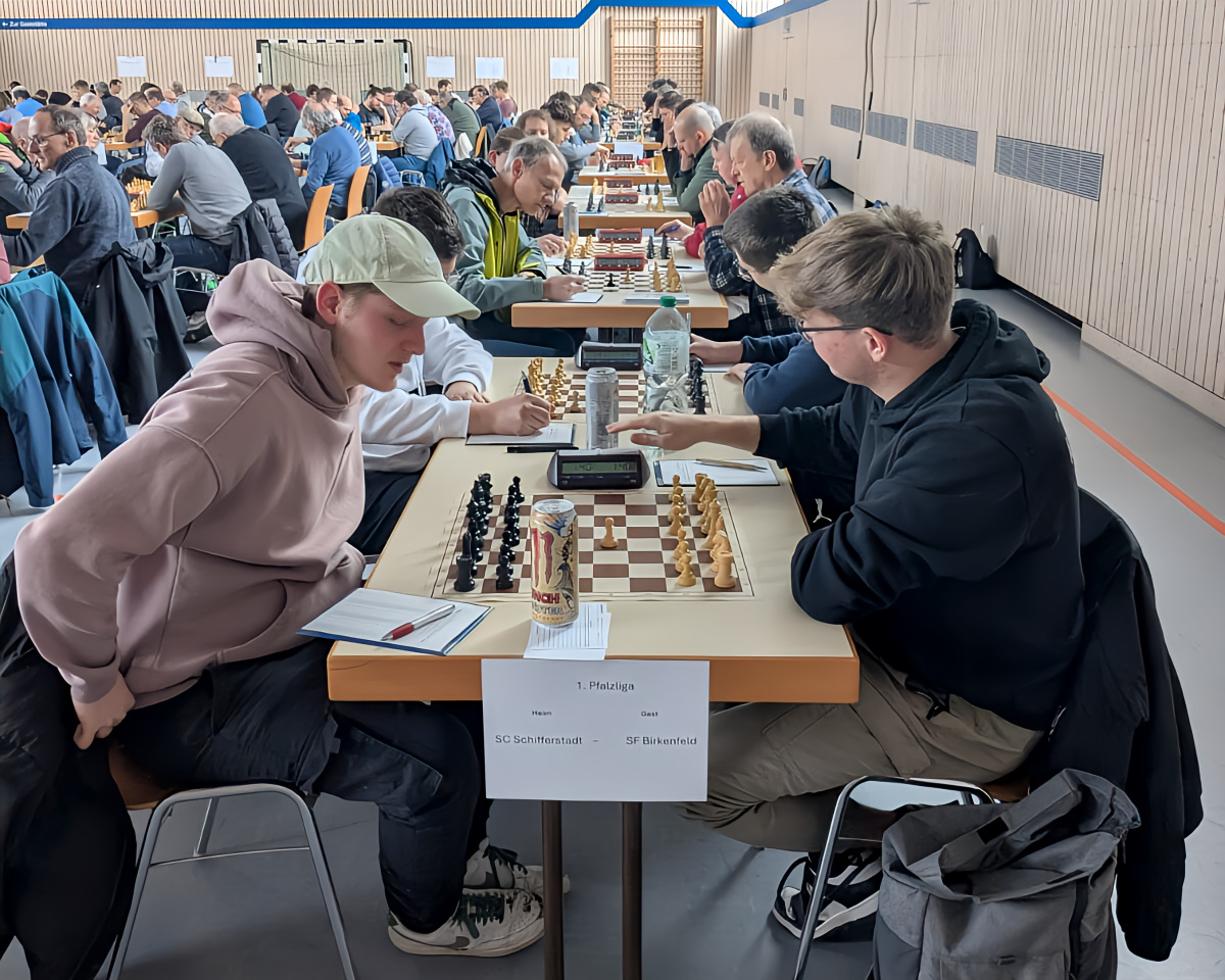 Am 30.03.2025 traten wir mit gehörigem Respekt bei der Mannschaft des SC Schifferstadt an, denn immerhin war es dem Team am 01.12. des vergangenen Jahres gelungen, den Meisterschaftsfavoriten aus Kaiserslautern zu besiegen. Und tatsächlich führten die Schifferstädter gegen uns Ähnliches im Schilde, schließlich konnten sie zwei starke Spieler extra für den Kampf gegen uns aktivieren. Wie erfreulich mutete es da an, dass unser Ersatz Mark-André Ruppenthal sehr schnell, nach circa 2 Stunden, seinen Gegner Christian Biedinger (DWZ 1754) besiegen konnte. Bei entgegengesetzten Rochaden und vielen weißen Felderschwächen beim Heimspieler konnte Mark-André in einer chaotisch anmutenden Stellung irgendwo den entscheidenden Schlag setzen. Genauso erfreulich war aber auch das folgende Remis von David Schwarz, der mit den schwarzen Steinen scheinbar mühelos gegen Erik Förster (DWZ 2115) remisierte. Aus der Eröffnungsschlacht war der Schifferstädter zwar mit einem Mehrbauern hervorgegangen, aber sein Springer verharrte noch auf der Grundreihe, der Turm Davids war sehr aktiv, bei extrem reduziertem Material führte die ausgeglichene Stellung bald zum Remis. Eine scheinbar ausgeglichene Stellung musste Tim Biehl auch gegen Tobias Faulhaber (DWZ 1869) verwalten, bis aber eine Ungenauigkeit von Tobias dazu führte, dass ein Freibauer Tims, kombiniert mit einem aktiven König auf der d-Linie nicht mehr gestoppt werden konnte. Wir führten 2,5 zu 0,5.