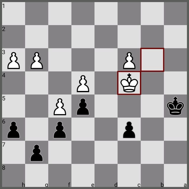 Ein Blick auf die übrigen Partien zeigte, dass sich zwei Spieler durchaus Sorgen machen mussten. Weder Milan Schneble noch Mario Ziegler standen besonders gut. Aber der Reihe nach. Niklas Leyendecker hatte gegen Ole Blunck (DWZ 1995) eine etwas bessere Stellung, zumal er gegen einen Isolani spielte und seine Figuren das Feld vor dem vereinzelten Bauern voll unter Kontrolle hatten. Da sich Ole aber gut verteidigte, mündete auch diese Partie irgendwann in den Remishafen ein. Der Berichterstatter hatte gegen Nils Winkler (DWZ 1922) eigentlich alles im Griff, plötzlich öffnete sich im Bauernendspiel sogar noch die Möglichkeit zum Sieg, aber das bekannte Motiv der Umgehung (siehe Diagramm) rechnete er nicht zu Ende und verlor.