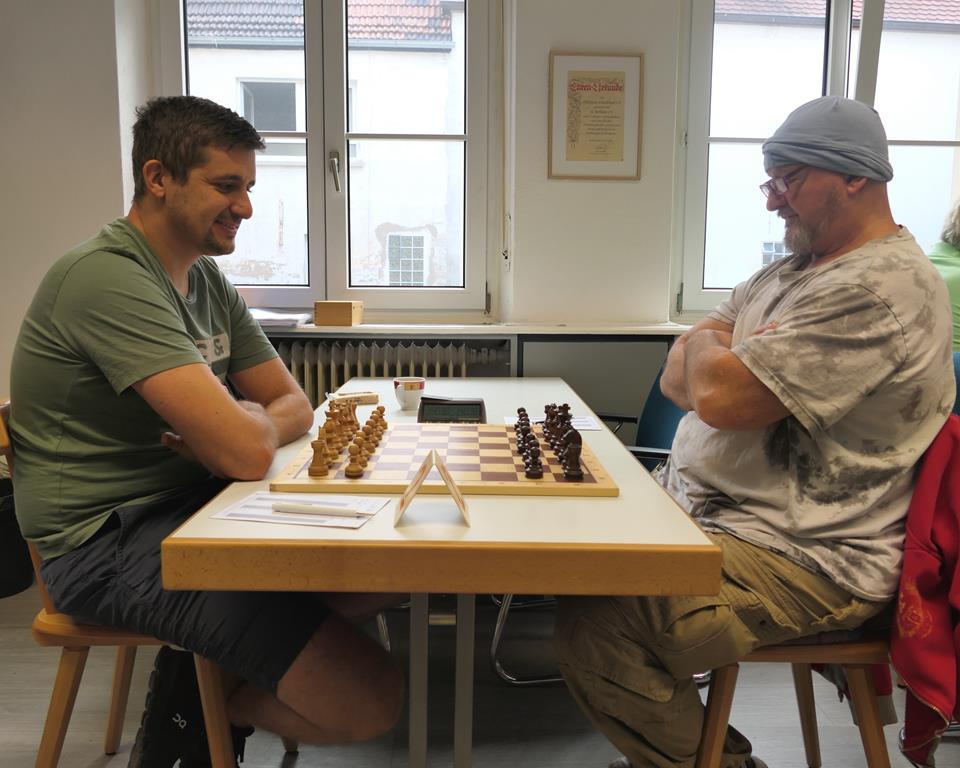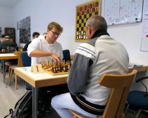 Die beiden übrig gebliebenen „Alten“ bemühten sich nun nach Kräften, wenigstens irgendwo noch einen halben Punkt zu ergattern. Mike Sidon fand dabei gegen den Eröffnungsaufbau seines Gegners Christian Fromm (DWZ 1978) kein wirkliches Konzept, insofern es als geschlossenes System fast jegliches Gegenspiel des Schwarzen im Keim erstickte. Stundenlanges Manövrieren war die Folge mit am Ende besseren Ausgang für den Heimspieler, ohne einen wirklichen Fehler für den Gast nachweisen zu können. Mario Ziegler kam aus der Eröffnung nicht besonders gut heraus, sein König war im Zentrum verblieben und musste nachher sogar – quasi aus der Not – zur langen Seite rochieren. Da stand der Monarch aber auch nicht sicher, das am Ende entstandene Läuferendspiel mit Minusbauern war für Mario nicht mehr zu halten, der Freibauer von Karlheinz Croissant (DWZ 1958) konnte mit Unterstützung des Läufers an der Umwandlung nicht mehr gehindert werden.