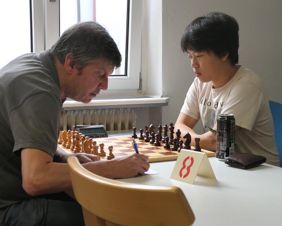 Mirco Friedhoff hatte seinem Gegner im Mittelspiel schon ein bis zwei Bauern abgenommen, irgendwo musste aber in der Folge eine Qualität verlustig gegangen sein. Sein Endspiel Läufer plus Mehrbauer gegen aber einen Turm konnte er gegen Lorenz Busch (DWZ 1946) nicht halten. Bei unserem Debütanten Zixuan Zhuang ergab sich im Mittelspiel eine pittoreske Stellung, da sich die vier Springer auf den Feldern e4, d4, e5 und d5 befanden. Von außen betrachtet befand sich die recht geschlossene Stellung immer im Gleichgewicht, so auch am Ende, als sich beide Kontrahenten auf ein Remis einigten, jetzt hatte Birkenfeld 3,5 Punkte.