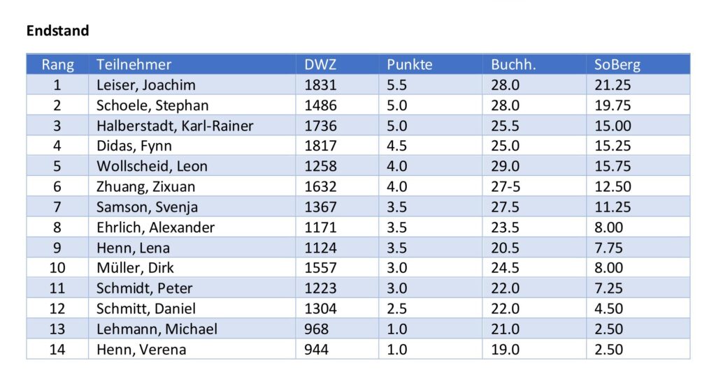 Bereits zum Auftakt gab es den ersten großen Knall: Nachwuchsspieler Leon Wollscheid trotzte der Nummer 1 der Setzliste, Joachim Leiser, ein Remis ab – und das in einer Stellung, in der er sogar auf Gewinn hätte spielen können. Beide sollten im weiteren Turnierverlauf noch eine zentrale Rolle spielen. In Runde 2 traf es den nächsten Topfavoriten: Charly Halberstadt musste sich Stephan Schoele geschlagen geben. Nach drei Runden blieb von den 14 Teilnehmern nur Jugendspieler Fynn Didas ohne Punktverlust. Fynn hatte sich in der 3. Runde gegen den Vorjahresvizemeister Zixuan Zhuang durchgesetzt und bis dahin in ausgezeichneter Form gezeigt. Doch die 4. Runde wirbelte die Tabellenspitze durcheinander: Leon gelang ein verdienter Sieg gegen Fynn, womit er gemeinsam mit Joachim die Tabellenführung übernahm.