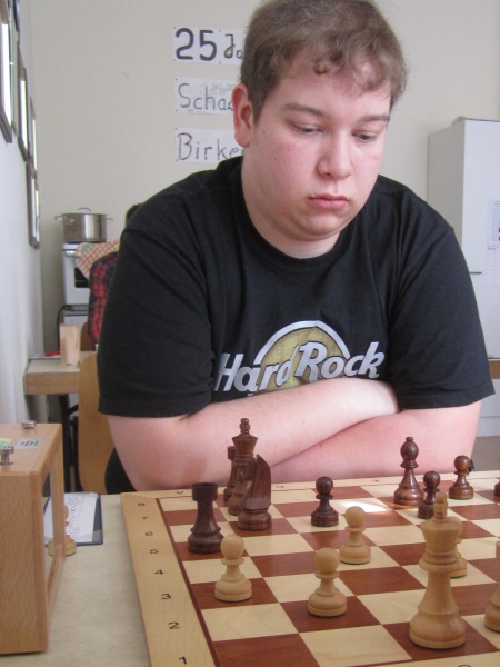 Nur noch der Mannschaftsführer der Schachfreunde Birkenfeld, Michael Hippenstiel spielte noch an Brett 3, ohne Dame. Dieses Spiel zog sich insgesamt fast 5,5 Stunden. Die meiste Zeit parierte Michael Hippenstiel die Angriffe seines Gegners und behielt, komme was wolle, sein Läuferpaar – das schon auf den Königsflügel schielte. Als sein Gegner in Zeitnot kam, nutzte der Mannschaftsführer der Schachfreunde diese Gelegenheit, um ins Spiel zu kommen. Danach folgten viele Schachs und angedrohte Abzüge. So schaffte er es die Dame und einen Turm des Gegners zu isolieren und konnte somit seine Türme und seine Läufer gut ins Spiel bringen. Der Spieler aus Wolfstein musste sich immer mehr zurückziehen und immer mehr Züge mit dem König machen, sodass Michael Hippenstiel gut attackieren konnte, um ein Matt vorzubereiten, was er auch schaffte, in dem er einen gedeckten Bauern mit seinem Turm schlug, was allerdings ein Abzugsschach hervorbrachte wobei dem Gegner nur ein Feld mit dem König blieb, welches der Mannschaftsführer einen Zug später ebenfalls angriff und somit Matt setzte.
