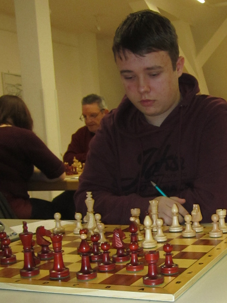 An Brett 4 verlor Verena Jacobs ihre Partie. Marcus Wiesen konnte von Brett 2 den Mannschaftskampf nach zwei schönen Scheinopfern, in deren Zug er vier Bauern gewann, wieder ausgleichen. Tim Baatz spielte an diesem Sonntag als Ersatzmann zum ersten Mal in der zweiten Mannschaft – drei Klassen höher als sonst. Doch das ließ er sich nicht anmerken, gewann an Brett 7 einen Offizier seines erfahrenen Gegners und brachte die Schachfreunde mit 2:1 in Führung!