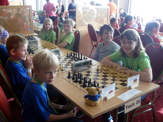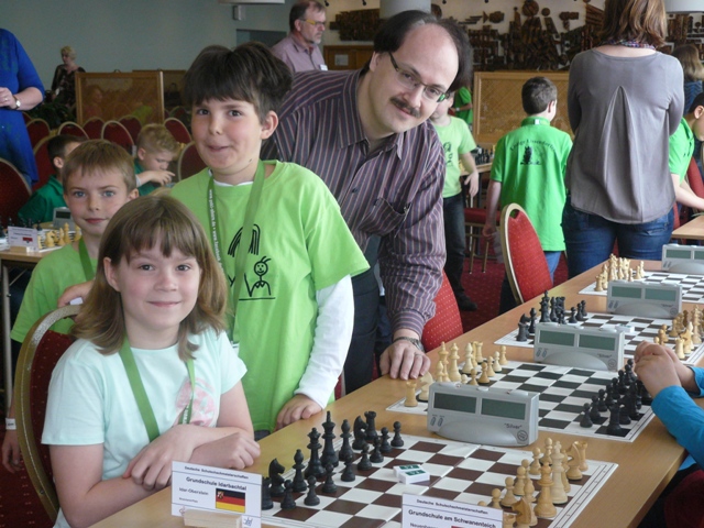 Womit wir bei den Hauptakteuren wären, der Mannschaft der Grundschule Idarbachtal (Idar-Oberstein). Nach der Vizemeisterschaft von Rheinland-Pfalz traten wir mit den gleichen Spielern, lediglich mit einer geänderten Brettreihenfolge, auf der Deutschen an. Der Schachclub Birkenfeld war mit Katharina Bohrer, Ryan Hanson sowie Sabine Ziegler als Betreuerin gut vertreten.