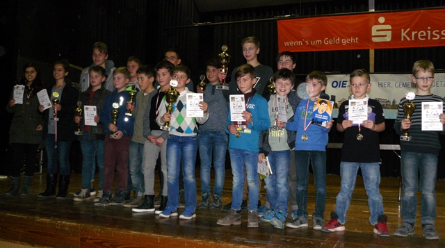 75 Teilnehmer, 13 Schulen, 7 Teilnehmer mit einer Wertungszahl über 1500 DWZ. Nein, das ist nicht die Kurzzusammenfassung des 12. Jugendschachturniers in Idar-Oberstein am 4. Dezember 2016, sondern die der 9. Auflage vor drei Jahren. Das waren noch Zeiten! Anno 2016 liest sich die Bilanz wie folgt: 40 Teilnehmer, 9 Schulen, ein einziger Teilnehmer mit einer DWZ über 1500. Was die Gründe für diesen negativen Trend sind, kann ich mir beim besten Willen nicht vorstellen. Das Turnier ist nach wie vor erstklassig organisiert durch die Verantwortlichen des SC Idar-Oberstein (vor allem Hans-Jürgen und Maximilian Klein) und das engagierte Team des Jugendamtes. Alle Kinder erhalten Preise und 2016 spielte sogar das Wetter mit. Gibt es einfach weniger Jugendspieler als vor drei Jahren? Angesichts der positiven Entwicklung des Schulschachs in den vergangenen Jahren ist das eigentlich kaum vorstellbar. Doch dass das Traditionsturnier in Idar-Oberstein noch wenige Tage vor seiner Durchführung auf der Kippe stand und bereits laut über eine Absage nachgedacht wurde, ist ein ausgesprochen schlechtes Zeichen. Ich denke, ich spreche im Namen unseres gesamten Vereins wenn ich dem SC Idar-Oberstein für 2017 wieder eine größere Teilnehmerzahl wünsche. An unserem Verein soll es nicht scheitern!