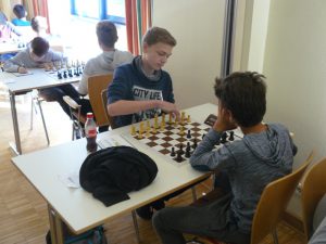 Dies ist die Schlussstellung von Niklas‘ Partie gegen Paul Hinrichs. Paul (Weiß) hatte früh eine riskante Gangart angeschlagen und Material geopfert, aber Niklas konnte den Angriff abwehren. In der Diagrammstellung steht Schwarz objektiv auf Gewinn, aber es ist verständlich, dass Niklas nach langer Verteidigung und mit immer noch schwieriger Figurenstellung gegen einen deutlich favorisierten Gegner das Schicksal nicht herausfordern wollte – Remis.