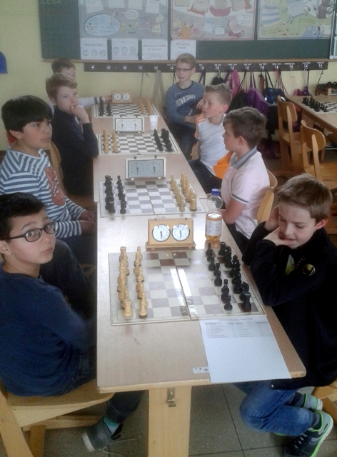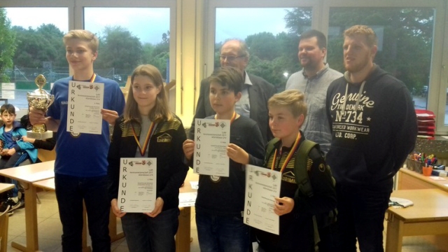 Mit zwei Mannschaften nahm unser Verein an der Jugend-Vereins-Mannschaftsmeisterschaft 2017 teil, die von den Schachfreunden Konz-Karthaus ausgerichtet wurden. In der U12 ging es für Ryan Hanson, Elias Cullmann, Lysander Grimm und Patrick Ehrlich vor allem darum, Erfahrung zu sammeln und sich für die anstehende deutsche Schulschachmeisterschaft „warm zu spielen“. Unsere vier Spieler sind alle noch in der U10 spielberechtigt, da die U12 aber die unterste Altersklasse für Jugendmannschaften ist, hatten sie es oft mit älteren Gegnern zu tun. Angesichts dieses Handicaps ist das Ergebnis – 7:7 Mannschaftspunkte und ein 8. Platz – als Erfolg zu werten. Mit 6,5 Punkten war Patrick der fleißigste Punktesammler vor Lysander (5 Punkte).