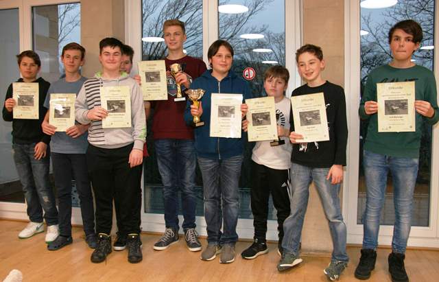 Die größten Hoffnungen auf vordere Plätze versprach von vornherein die U14. Hier gingen mit Emil Bleisinger, Niklas Leyendecker und Simon Rommelfanger drei Spieler an den Start, die sich in der letzten Zeit in ausgesprochen guter Form präsentiert hatten. Allerdings war das Feld nicht zu unterschätzen: Hagen Lommel (Eisenberg), Pfalzmeister 2016 in der U12 und Vizemeister 2017 in der U14 war ebenso ein ernstzunehmender Titelaspirant wie Josua Scherer (Bann). Mit dem letztjährige U12-Meister Ibrahim Halabi (Ludwigshafen) mischte noch ein weiterer Spieler kräftig im Kampf um den Titelgewinn mit. Leider erwischte Simon nicht seine beste Woche und beendete das Turnier mit 1,5 Punkten auf dem letzten Platz. Dass auch er seine gute Laune nicht verlor, spricht für ihn – und für ihn spricht ebenso, dass er völlig unbeeindruckt von diesem harten Turnier nur einen Tag nach der Siegerehrung einen enorm wichtigen Punkt in der 5. Mannschaft einfuhr, der letztlich zum Grundstein für den 4,5:3,5-Erfolg unseres Teams in Weilerbach wurde.