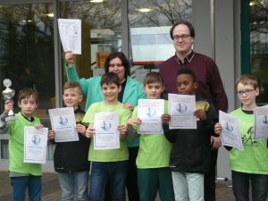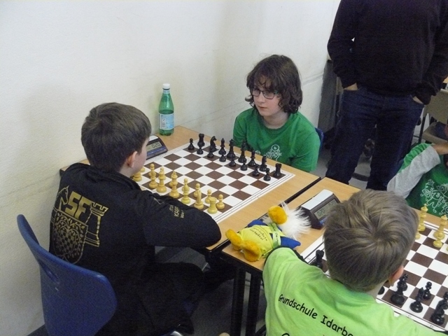 Der Sieg in der 6. Runde gegen Oppenheim bedeutete bereits die vorzeitige Qualifikation, so dass ich – ganz anders als in vielen früheren Schulschachturnieren – die Schlussrunde relativ ruhig verfolgen konnte. Auch hier ließ meine Mannschaft nichts anbrennen, gewann 3:1 gegen die Pestalozzi-Grundschule Kaiserslautern und sicherte sich damit einen großartigen zweiten Platz. Patrick gewann zudem den Brettpreis an Brett 2. Alle Ergebnisse auf der Seite des Bildungsservers Rheinland-Pfalz, zudem hat Sabine einen Bericht für die Homepage der Grundschule Idarbachtal geschrieben.
