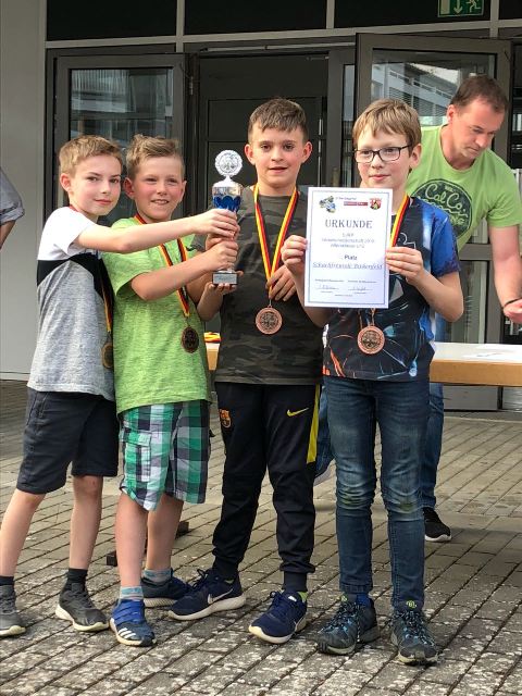 An Platz 8 gesetzt, am Ende Dritte: So die Bilanz unserer U12-Mannschaft bei der diesjährigen rheinland-pfälzischen Jugend-Mannschaftsmeisterschaft in Kastellaun. In der Besetzung Elias Cullmann, Patrick Ehrlich, Lysander Grimm und Ryan Hanson mussten unsere Jungs nur der SG Trier und Turm Lahnstein den Vortritt lassen. Nach einem Auftaktsieg gegen die U14w-Mannschaft von Post Trier, einem starken Unentschieden gegen den SC Bann sowie zwei Niederlagen gegen SK Gau-Algesheim und Turm Lahnstein verhalf ein toller Endspurt mit hohen Siegen gegen Dillendorf-Liederbach (3,5:0,5), SF Mainz (4:0) und Post Trier (4:0) zum unerwarteten Sprung aufs Siegerpodest. Das beste Einzelergebnis unserer Mannschaft erzielte Ryan mit 6 Punkten an Brett 4.