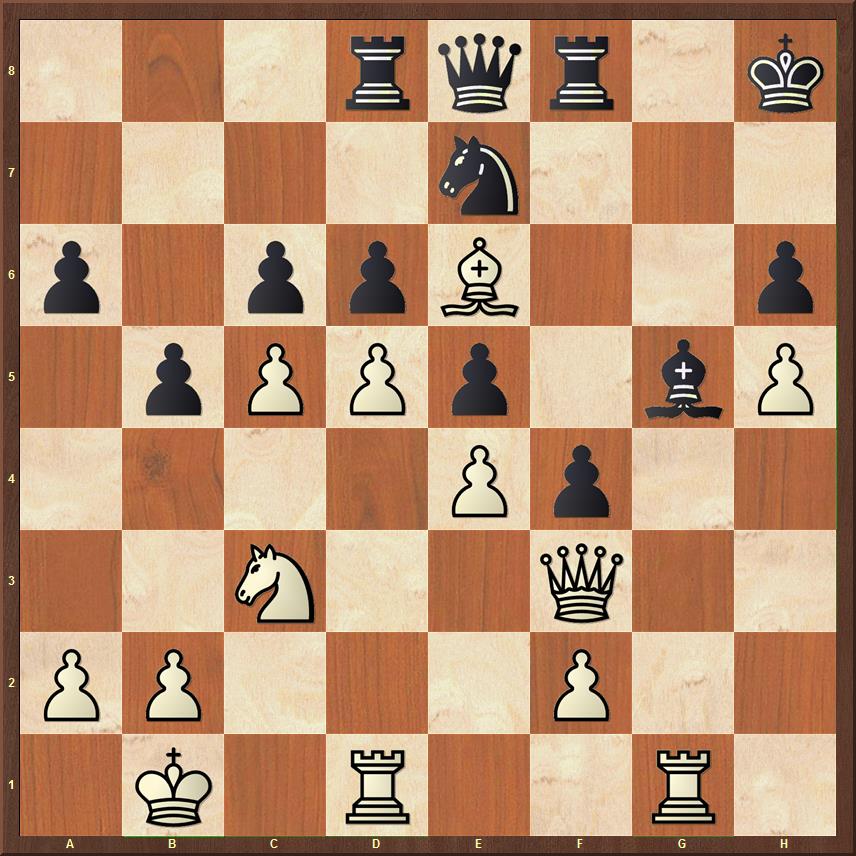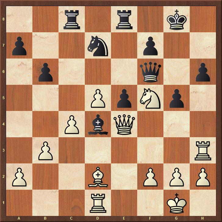 Hier kann Weiß (Qizhou) gewinnen, aber dafür muss sie das Opfer 25.Txg5! finden (25…hxg5 26.Dg4 und vermutlich muss Schwarz nun mit 26…Tg8 die Qualität zurückgeben, wonach Weiß aber auf Gewinn steht). Aber das muss man natürlich erst einmal sehen. In der Partie folgte 25.Tg2? Sg8 26.Dh3 (vielleicht geht das Qualitätsopfer immer noch, aber nun ist es alles andere als klar, geschweige denn gewonnen: 26.Txg5 hxg5 27.Dg4 dxc5 und nach 28.Dxg5 kann Schwarz 28…De7 spielen, was alles deckt) 26…dxc5. Mittlerweile hat Weiß einen Minusbauern, aber mit Sicherheit ausreichend Kompensation dafür. Nach 27.d6? hingegen fällt noch ein zweiter Bauer: 27…Tf6 28.Lf5 Tfxd6, wonach Schwarz plötzlich auf Gewinn steht und diesen nach 42 Zügen auch realisierte.