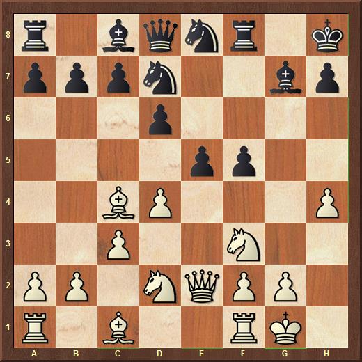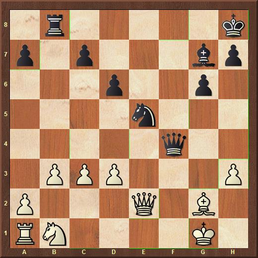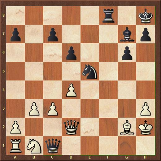 Es ist offensichtlich, dass bei Weiß die Eröffnung nicht gut gelaufen ist: Der König steht unsicherer als der schwarze, vor allem ist der Damenflügel unterentwickelt. Genau dieses Problem hätte Weiß nun angehen müssen. Nach 23.Sd2, was sozusagen den einzigen noch spielbaren Zug darstellt, kann Schwarz zwischen 23…Dg3 und 23…Lh6 wählen und steht in beiden Fällen deutlich angenehmer, aber noch nicht auf Gewinn. Nach der Partiefortsetzung sieht dies ganz anders aus: 23.d4? Dc1+! 24.Kh2 (24.Df1 scheitert natürlich an 24…Db2) 24…Tf8 25.Dd2.