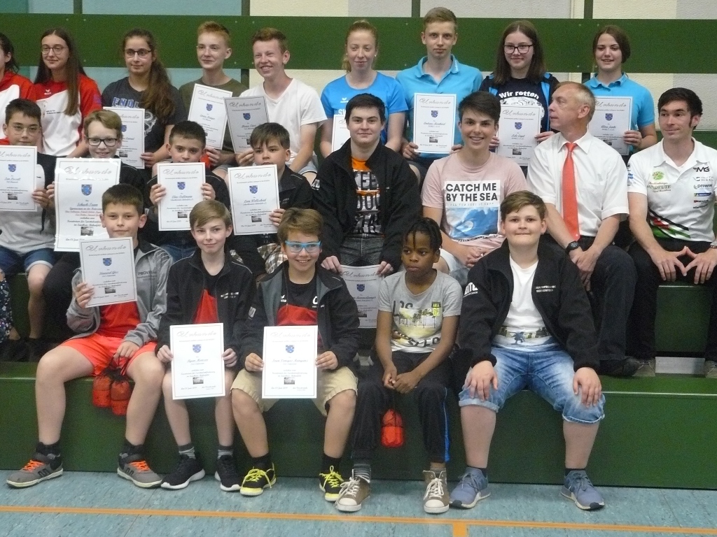 Alljährlich ehrt das Kuratorium für Sporttalentförderung im Kreis Birkenfeld bei seiner Jahresversammlung erfolgreiche Nachwuchssportler aus verschiedenen Diszipinen. Bei der letzten Veranstaltung Anfang Juni waren auch wieder etliche unserer Talente dabei. Da die Erfolge auf Rheinland-Pfalz-Ebene und darüber nicht bei dieser Ehrung, sondern der Wahl zum Sportler des Jahres ausgezeichnet werden, die im Februar 2020 stattfinden wird, wurden diesmal „nur“ Erfolge bis zur Pfalzmeisterschaft berücksichtigt. Bei der Veranstaltung in der Stadenhalle in Tiefenstein fehlten folglich Niklas Leyendecker (2. Platz Rheinland-Pfalzmeisterschaft U16), Katharina Bohrer (2. Platz Rheinland-Pfalzmeisterschaft U16w) sowie die erfolgreiche U16-Mannschaft, die sich vor Kurzem die Vizemeisterschaft ihrer Altersklasse sichern konnte (Niklas Leyendecker, Emil Bleisinger, Marius Lang, Jonas Wollscheid). Alle diese Sportler werden im Februar 2020 geehrt werden.