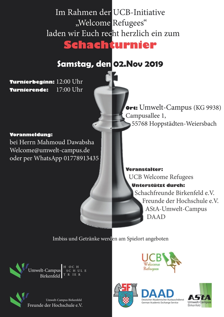 Die Zusammenarbeit zwischen dem Umwelt-Campus Birkenfeld und den Schachfreunden führt zu einem weiteren Highlight. Bereits 2016 richteten wir gemeinsam im wunderschönen Kommunikationsgebäude des Campus ein Schnellturnier im Rahmen der Initiative „Welcome Refugees“ aus, an dem 26 Schachspieler teilnahmen. Nachdem wir 2017 an gleicher Stelle anlässlich unseres 30jährigen Vereinsjubiläums ein Partnersimultan mit IM Nikolas und WGM Melanie Lubbe durchführen durften, wird es in Kürze erneut ein Schnellturnier geben. Organisator ist wie 2016 Mahmoud Dawabsha, der auch die Voranmeldungen unter Welcome@umwelt-campus.de oder per WhatsApp unter 0177 8913435 entgegennimmt.