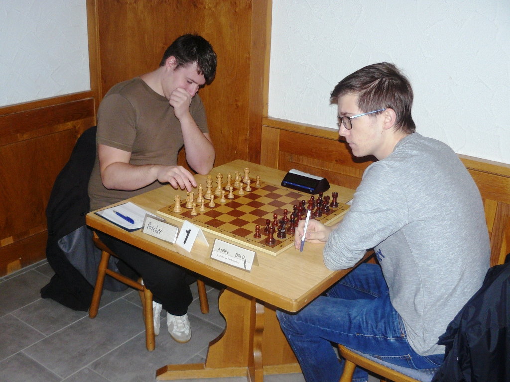 Mario Ziegler konnte an Brett 7 den extra für diese Match nachnominierten Fide-Meister Fred Feibert neutralisieren und in ausgeglichener Mittelspielstellung ein Remis erzielen. Eine starke Leistung vollbrachte Ernst Michael Porcher an Brett 1, an welchem er seinen 250 DWZ-Punkte stärkeren Gegner Andre Bold mit starkem Initiativ-Schach stundenlang beschäftigte. Da dieser sich aber gut verteidigte, war die Punkteteilung am Ende das logische Ergebnis. Erst einige Stunden später gab es die nächsten Ergebnisse. Marc André Ruppenthal landete in einem Endspiel, in welchem sein Gegner Marius Herrmany zwei verbundene Freibauern auf der einen, Marc André einen einzigen auf der anderen Seite hatte. Die beiden verbundenen Freibauern sollten sich dann als zu stark erweisen. Bald konnten wir aber wieder ausgleichen. IM Herbert Bastian ging aus einer Belagerung des gegnerischen Königsflügels mit Bauerngewinn hervor, diesen Vorteil verwertete er im Endspiel sicher. Überhaupt besticht unser Neuzugang bisher durch sehr souveränes Spiel. Kurz danach musste Vladimir Paskalutsa an Brett 5 ins Remis einwilligen. Er schien eine Gewinnstellung herbeigeführt zu haben, der Königsflügel seines Gegners sah sehr luftig aus, letztlich übersah er aber einen Konter des Gegners und hatte am Ende nicht mehr als ein Dauerschach. Spielstand nach fünf entschiedenen Partien: 2,5 zu 2,5. Die letzten drei Partien mussten nun für die Entscheidung sorgen. Dabei hatte Mike Sidon an Brett 5 gegen Bert Schwarz noch die besten Aussichten. In einem eigentlich gewonnenen Turmendspiel ließ er seinen Gegner aber in die Philidor-Verteidigung entwischen, aus der sich dieser mit präziser Verteidung – trotz gefühlter stundenlanger Versuche Mikes – nicht mehr herauslocken ließ. Am Ende stand ein Patt mit Mehrbauern, Remis. Je länger die Partie von Niklas Leyendecker an Brett 2 dauerte, desto mehr neigte sich diese zu seinen Ungunsten. Im Endspiel musste sich sein eher schlechter Läufer gegen den agilen Springer seines Kontrahenten Marcel Agné stemmen, der zudem noch einen Freibauern unterstützen konnte. Am Ende war dieses Duo zu stark, Thallichtenberg ging in Führung. An Brett 4 verlor Maxi Klein im Mittelspiel einen Bauern, was seinem Gegner Tobias Burkhardt ein großes Plus bescherte. Irgendwie schaffte es Maxi aber in ein Damenendspiel und konnte hier den gegnerischen König mit zahlreichen Schachs belästigen. Mehr als ein Remis war aber nicht drin, dieses nahm der Thallichtenberger auch trotz Mehrbauern an, um den Mannschaftssieg abzusichern. Dadurch hat Thallichtenberg nun mit 0 Minuspunkten eindeutig den Weg Richtung Meisterschaft eingeschlagen, wir ordnen uns erst einmal im Mittelfeld ein. Unsere Leistung selbst darf als ein großer Kampf gewürdigt werden, wobei als Analyse für die Niederlage schon der Hinweis ausreichen dürfte, dass eine einzige Gewinnpartie prinzipiell zu wenig ist, um so einen Spitzenkampf zu gewinnen.