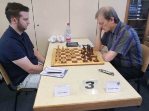 Kurze Zeit später erhöhte Niklas Leyendecker auf 2 zu 0, indem er seinem Gegner Niclas Burg kaum Gegenspiel ermöglichte und ihn am Königsflügel dann selbst überspielte. Ein Qualitätsgewinn sowie eine unkoordinierte Stellung des Gastspielers reichten locker zum Sieg. Fast zeitgleich einigen sich dann Lena Mader und Mario Ziegler auf Remis. Mario konnte dabei in vielleicht etwas schlechterer Stellung durch Zugwiederholung Remis reklamieren, Lena landete in einem ungleichfarbigen Läuferendspiel, das ja bekanntermaßen Remis ist. Nun stand es zwar schon 3 zu 1 für uns, doch spannend war es nach wie vor, zumal sich sowohl der Berichterstatter als auch Ernst Michael Porcher in einer recht schlechten Stellung befanden. Hinzu kam, dass Tim Biehl bald gegen Patrick Boos das Nachsehen hatte. Er verlor im Mittelspiel einen Bauern und konnte nachher mit Minusqualität und offener Königsstellung keinen Widerstand mehr leisten. Ernst Michael musste bald danach aufgeben. Bereits in der Eröffnung musste er einen Bauern geben, um noch Schlimmeres zu verhindern. Der oberligaerfahrene Thomas Steinkohl baute seinen Vorsprung kontinuierlich aus und glich den Mannschaftskampf damit aus, Spielstand 3 zu 3.