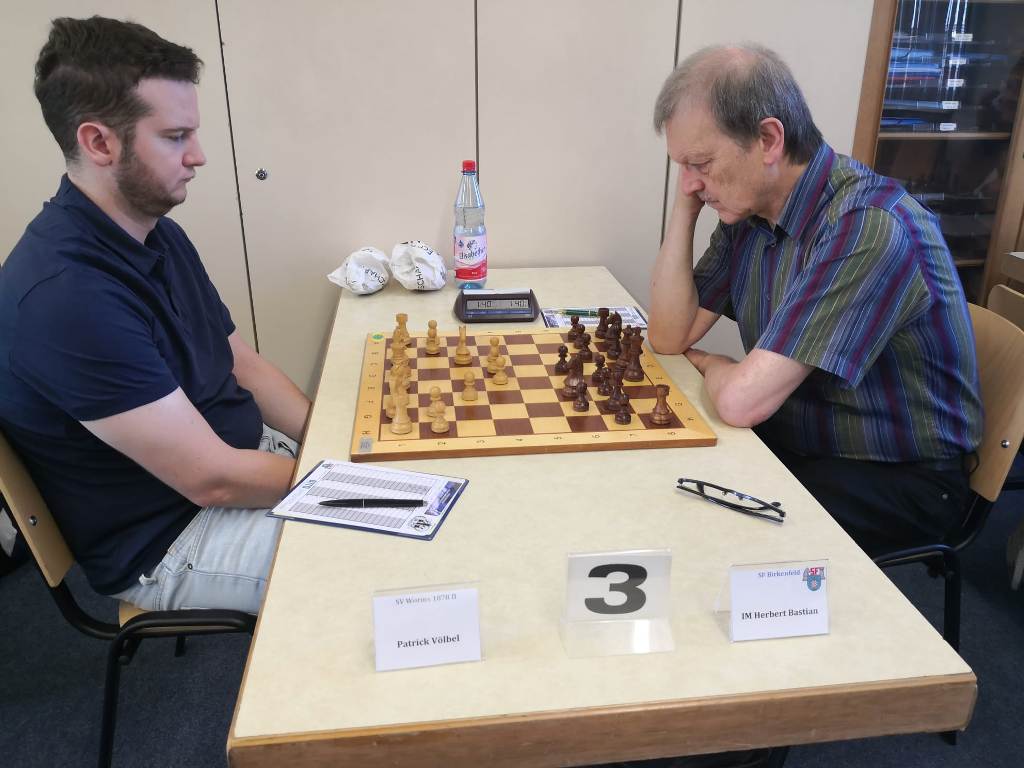 Am Sonntag, den 24.07. empfingen wir den Spitzenreiter aus Worms, der mit einem Sieg bei uns seinen Aufstieg perfekt machen konnte. Aber wir hatten etwas dagegen, sodass es ein fast sechsstündiges episches Match wurde. Die erste entschiedende Partie ereignete sich am zweiten Brett, wo Frank Mayer gegen IM René Dausch ein taktisches Versehen nutzen konnte, um den Gegner zur Aufgabe zu zwingen.