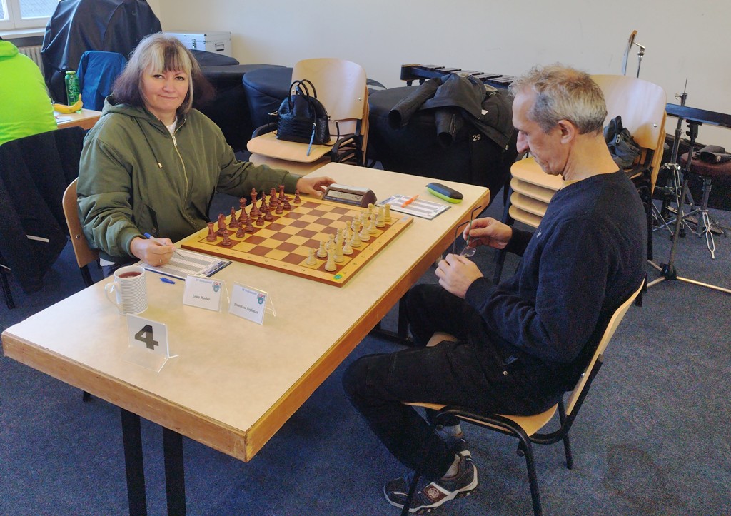 Emil Bleisingers Strategie war am ersten Brett gegen Mark Andre Ruppenthal vor allem auf Raumvorteil angelegt und fast wäre diese Strategie auch aufgegangen. Im Endspiel hatte Emil einige gewinnverheißende Fortsetzungen gehabt, die aber ohne Computerhilfe schwer zu sehen waren. Dazu hätte man entstehende Turmendspiele schon korrekt einschätzen müssen und wie man weiß, sind die meisten Turmendspiele ja Remis. Die Partie endete in einer ausgeglichenen Endstellung dann tatsächlich auch Remis. Nun waren noch drei Partien am Laufen. Tim Biehl hatte gegen Michael Hippenstiel (Brett 5) in einem Turmendspiel zwar einen Mehrbauern, aber Michael hatte einfach den aktiveren Turm und auch noch eine bessere Königsstellung. Zumindest für einen außen stehenden Beobachter schien es unmöglich, diesen Vorteil irgendwie zu verwerten. Tim probierte es längere Zeit, aber am Ende musste er sich in das Unentschieden fügen. Wohl auch hoffend, dass Lena ihre Partie gegen Jaroslaw gewinnen würde. Und das musste sie dann auch, denn kurze Zeit später endete auch die Partie von Mario Ziegler gegen Uwe Kendzior. Uwe hatte zwar eine völlig offene Königsstellung, aber irgendwie war seinem König überhaupt nicht beizukommen, ganz im Gegenteil, Uwe hatte plötzlich auf c3 einen gefährlichen Freibauern und, sei es dem großen Respekt gegenüber Mario geschuldet oder aber auch den Ambitionen der ersten Mannschaft, Uwe willige in das von Mario angebotene Remis ein. Unglaublich, alle vier Partien endeten – ausgekämpft – Remis.