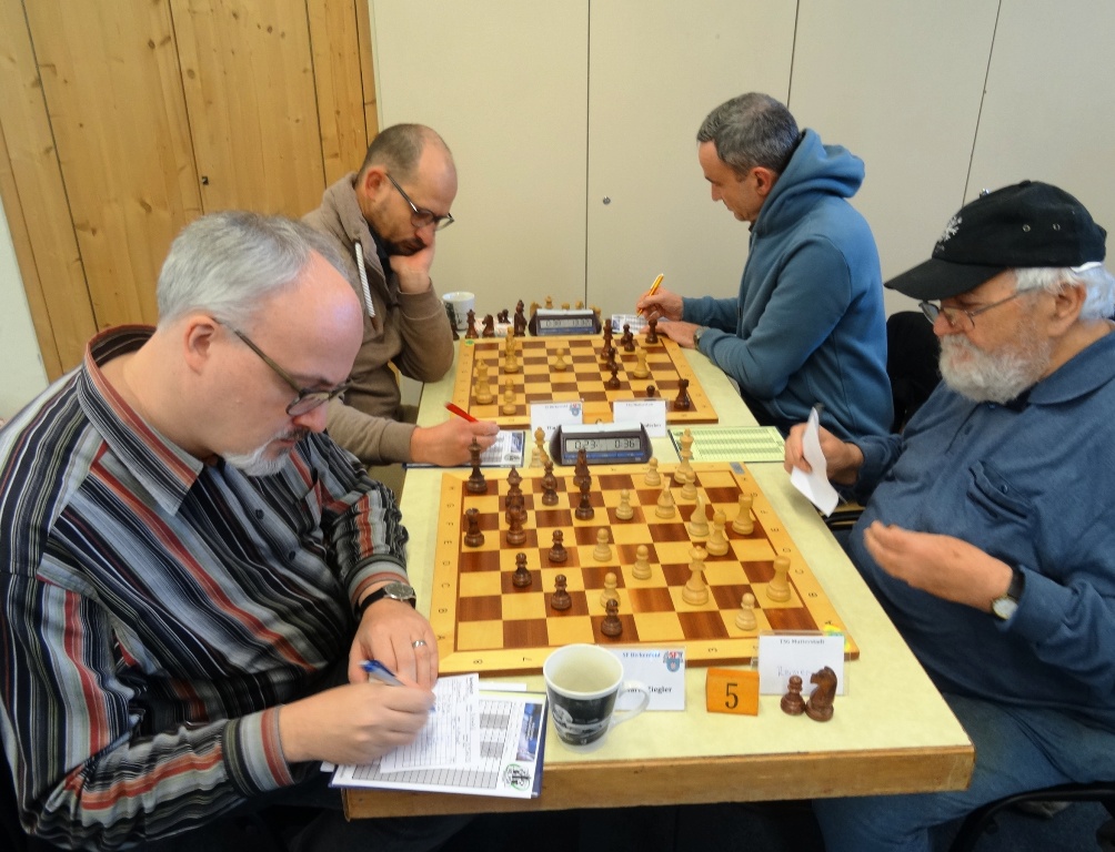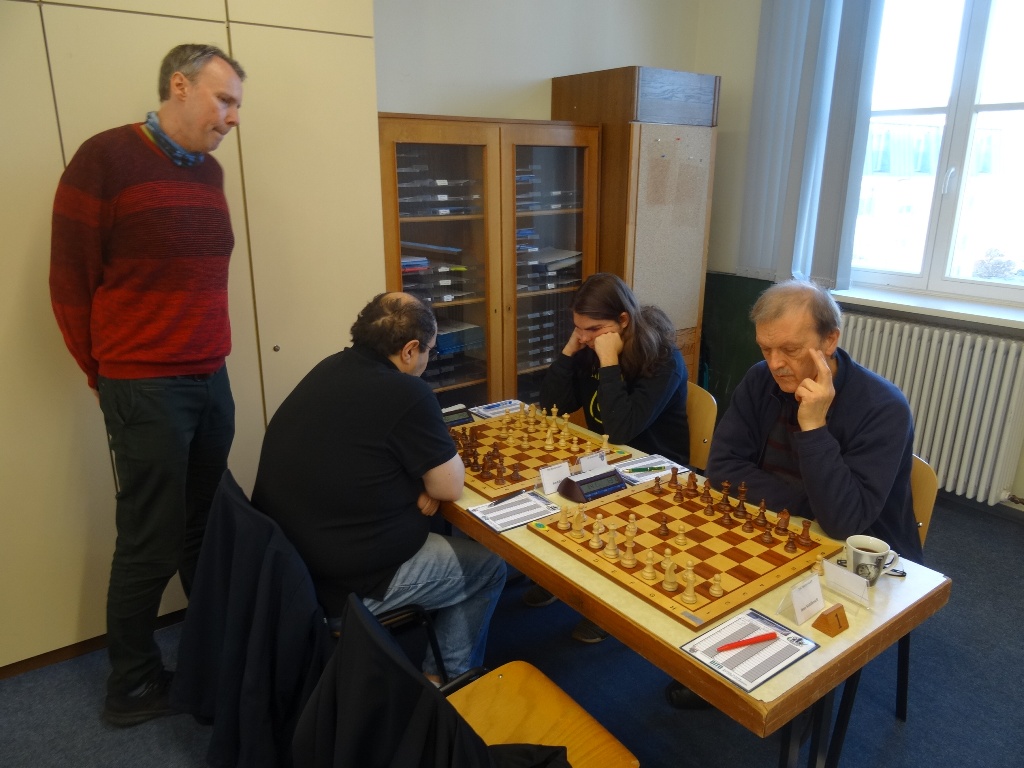 Am gestrigen Sonntag, den 13. November, hatten wir Gelegenheit, uns für die Niederlage aus der letzten Saison gegen Mutterstadt zu revanchieren. Dabei war es jedoch kein gleicher Kampf, denn die Gäste mussten Brett 7 und 8 freilassen, sodass wir bereits mit 2 zu 0 führten. Allerdings machten es uns die Mutterstädter in den folgen Stunden nicht einfach. Als Erstes erhöhte Herbert Bastian am ersten Brett auf 3 zu 0. Sein Gegner Jens Kohlbruch hatte es zwar in ein vermeintlich ausgeglichenes Endspiel von zwei Türmen und Läufer auf beiden Seiten gebracht, allerdings besaß der Mutterstädter die wesentlich schlechtere Leichtfigur, da sein Läufer an der Verteidigung des Bauern d4 gebunden war, während sich sein Gegenüber frei bewegen konnte. In Kombination mit einem Turmschwenk auf der 6. Reihe nutzte Herbert das für einen Mattangriff. Bemerkenswert ist, dass Herbert dem Phänomen der besseren Leichtfigur vor kurzem noch zwei komplette Trainingsabende in unserem Verein widmete.