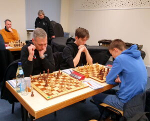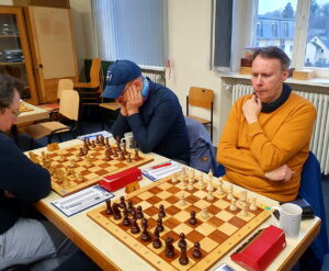 Dirk Müller ließ gegen Michael Schaefer (DWZ 1743) nach h6 nebst g5 das klassischen Opfer auf g5 zu, sodass sein verbleibender Springer auf f6 lange Zeit einer unangenehmen Fesselung ausgesetzt war. Kombiniert mit den heranstürmenden gegnerischen Bauern war der Königsflügel am Ende nicht mehr zu verteidigen. Zwischenzeitlicher Spielstand: 3 zu 1. Milan Schneble gelang es eindeutig, das Eröffnungsduell für sich zu entscheiden. Seinem Gegner Max Arndt (DWZ 1483) war es nicht mehr möglich zu rochieren, ein Umstand, an dem insgesamt die ganze Partie des Pirmasensers krankte. Milans Entwicklungsvorsprung mündete am Ende in einen heillos überforderten Königsflügel, er verwertete leicht zum 4 zu 1. Uwe Kendziors Partie war sehr lange Zeit ausgeglichen, obwohl er ein wenig passiv stand. In dem Bestreben, etwas aus der Partie rauszuholen, verbrauchte sein Gegner Klaus Ludy (DWZ 1819) sehr viel Zeit und stellte dann in Zeitnot eine Figur ein. Der Berichterstatter spielte in seiner Partie zu wenig natürliche Züge, am Ende sickerten die schwarzen Figuren fast widerstandslos in seine Stellung ein, es gab gar keine sinnvollen Züge mehr, er musste David Schwarz (DWZ 1834) zum Sieg gratulieren. Nach ungefähr 4 Stunden Spielzeit brachte Tim Biehl das Kunststück fertig, seinen Gegner Michael Müller (DWZ 1830) mit Springer und Läufer matt zu setzen. Wer hätte das geschafft? Endstand 6 zu 2. Am 28.01.2024 steht wieder ein Heimspiel auf dem Programm, dann geht es gegen den Tabellennachbarn SC Herxheim.