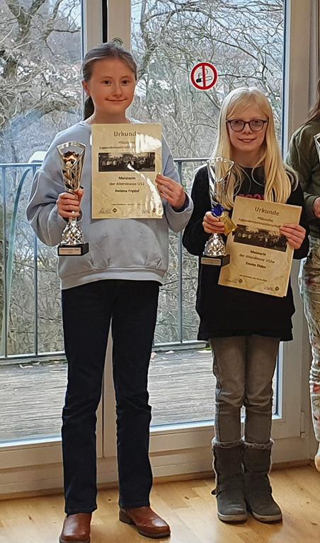 Da Helena die Gesamtwertung gewann, ging der Titel der Pfalzmeisterin an das zweitplatzierte Mädchen: Unsere zweite Starterin Emma Didas. Bei Emma wechselten sich Siege und Niederlagen ab, wobei man nicht vergessen darf, dass fast alle ihrer Gegner über mehr Erfahrung in Turnieren verfügten. So sind 5,5 Punkte und Platz 16 unter 26 Teilnehmern als Erfolg zu betrachten. Sie platzierte sich deutlich vor der Zweiten in der Wertung U12w, Olena Starostina (Bad Dürkheim-Wachenheim).