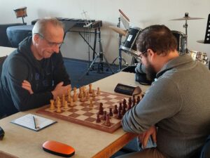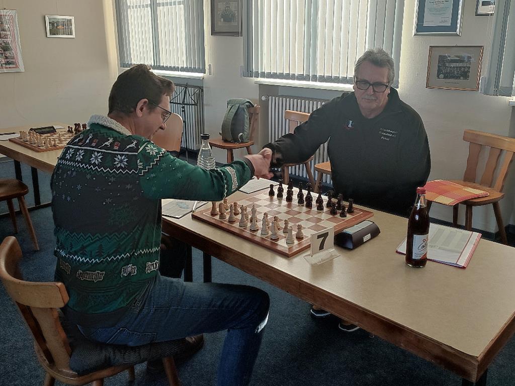 Irgendwie ist es doch erfreulich, wenn man bei einem auf Augenhöhe zu erwartenden Kampf schon früh – und zwar kampflos – mit 1 zu 0 in Führung liegt. So geschehen am 28. Januar im Duell gegen den Tabellennachbarn aus Herxheim. Mirco Friedhoff war der Glückliche oder der Leidtragende, je nachdem, wie man es sieht. Der krank in das Match gestartete Berichterstatter bot dann auch schon nach 8 Zügen ein Remis an, was sein Gegner Rainer Kopf (DWZ 1850) nach kurzer Überlegung annahm. Peter Lozar kam gegen seinen Gegner Ralf Müller (DWZ 1207) mit Vorteil aus der Eröffnung, da ihm hier bereits ein Bauerngewinn gelang. Schon mit einer Figur weniger probierte es der Gast noch einmal – wohl aus Verzweiflung – mit einem Läuferopfer auf h7, was von Peter aber problemlos pariert werden konnte. Kurze Zeit später erfolgte die Aufgabe.